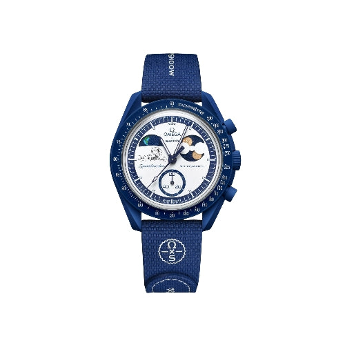 This chronograph features a navy Bioceramic case, crown, and pushers, paired with a matching navy rubber strap and a Bioceramic loop. It has a white opaline dial with hour markers coated in Grade A Super-LumiNova® (green emission). At the 10 o’clock position, the earth phase indicator shows the Earth with oceans that glow blue under UV light. Beneath the earth phase indicator is an illustration of Snoopy and Woodstock on the Moon, marveling at the enchanting spectacle of Earth. The illustration showcases a phrase that appears only under UV light. At the 2 o’clock subdial, is a moon phase indicator with two radiant full moons, both coated with OMEGA’s Moonshine™ Gold. One of the moons is designed in the distinctive style of the world of Snoopy, while the other is reimagined with an unexpected popcorn design.